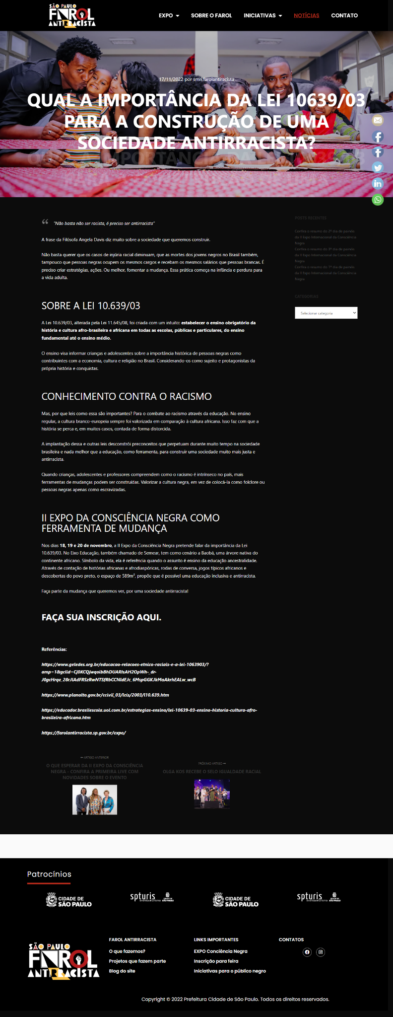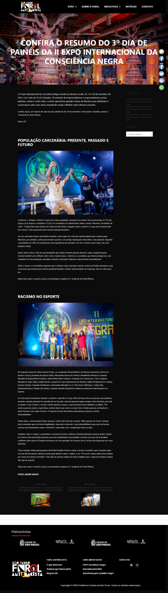 Neste projeto, participei como conteudista. Criei roteiros de vídeos, apresentações, entrevistas, folder, copy e legenda para redes sociais, posts para blog e releases. Também formatei e criei todo o texto do site da política pública, parceria das secretarias de Relações Internacionais e de Educação da Prefeitura de São Paulo, Farol Antirracista. E por último, nos dias do evento, atuei como produtora de estúdio e entrevistadora.